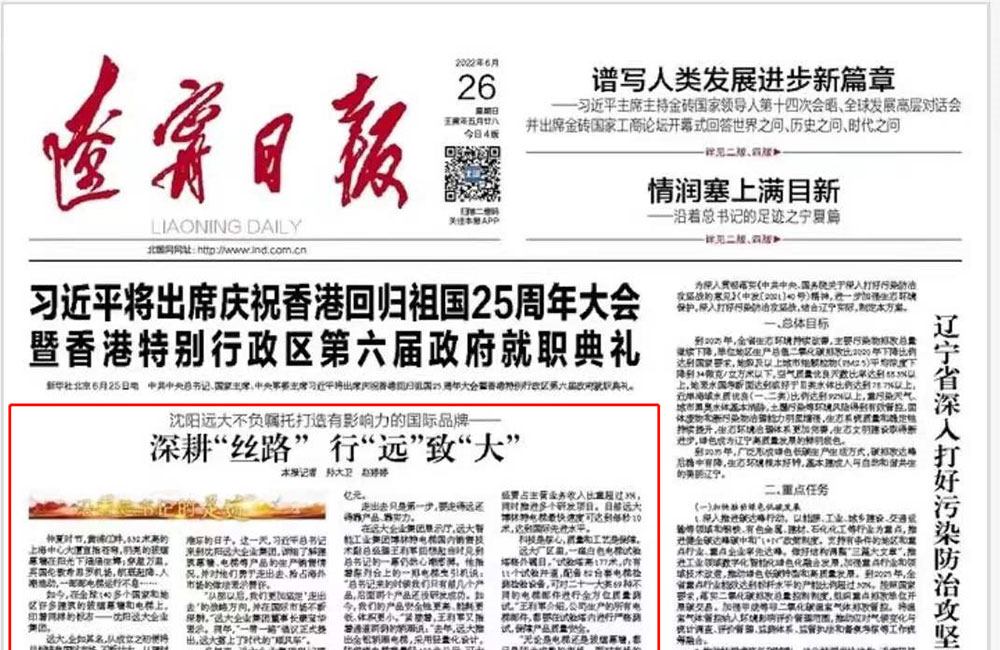 6月26日出版的《辽宁日报》在头版重要位置刊登了题为《沈阳远大不负嘱托打造有影响力的国际品牌——深耕“丝路” ,行“远”致“大”》的文章。